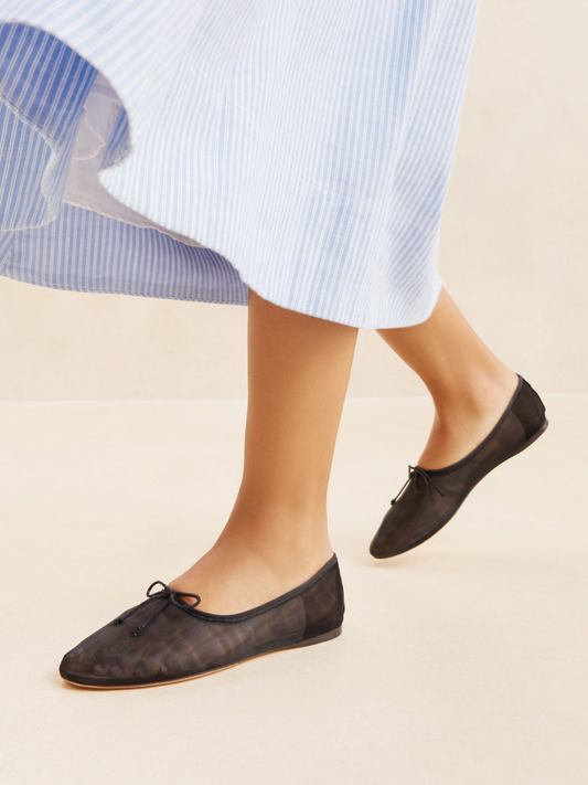 Black Mesh Super Cute Bow Ballet Flats With Almond Toe