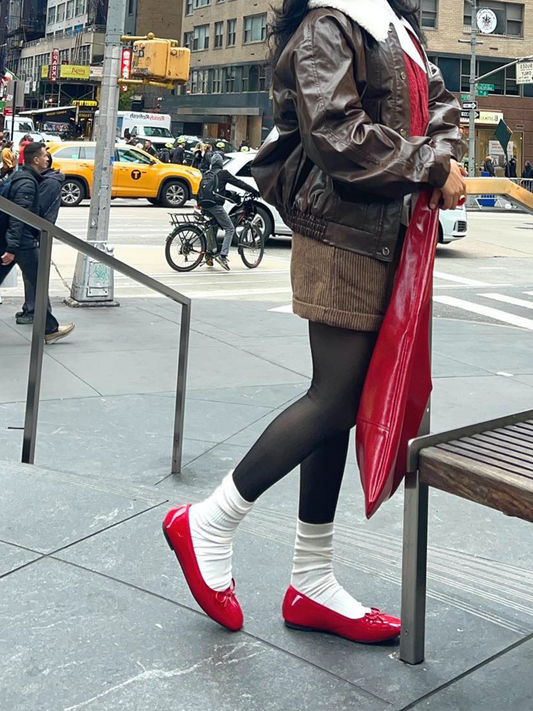 Red Bow Ballet Flats With Square Toe In Patent Vegan Leather