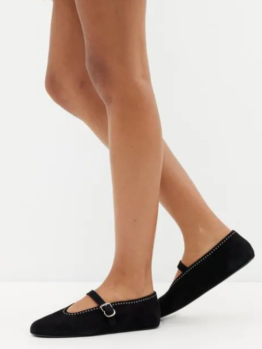 Black Faux Suede Eyelet Ballet Flats Mary Janes With Buckled Strap
