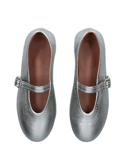 Metallic Silver Eyelet Ballet Flats Mary Janes With Buckled Strap