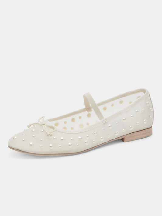 Ivory White Bow Pearl Semi-Transparent Mesh Ballet Flats Mary Janes