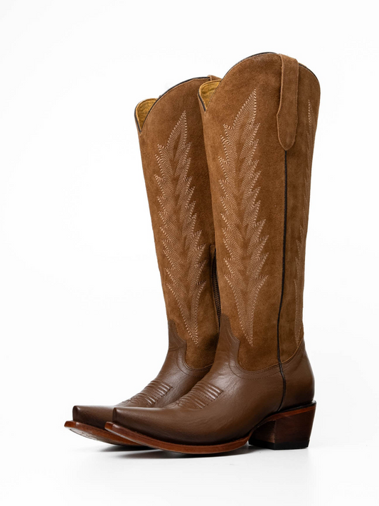 Distressed Brown Snip-Toe Stitch Wide Mid Calf Cowgirl Boots