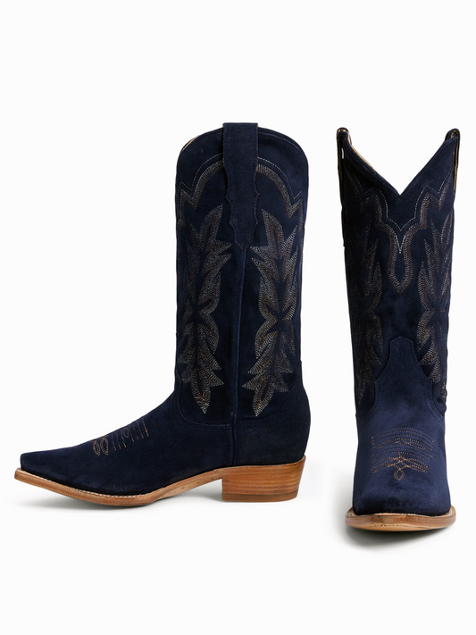 Dark Blue Faux Suede Western Embroidery Snip-Toe Mid Calf Cowgirl Boots