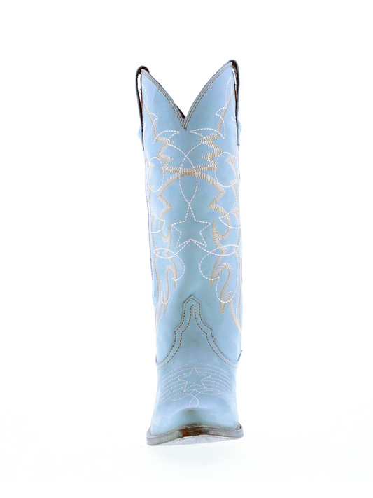 Powder Blue Pointed-Toe Star Embroidery Wide Mid Calf Tall Western Boots
