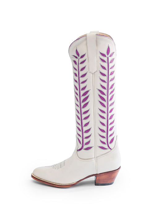 Almond-Toe Grape Purple Leaves Inlay Wide Calf Tall Knee High Cowgirl Boots - White