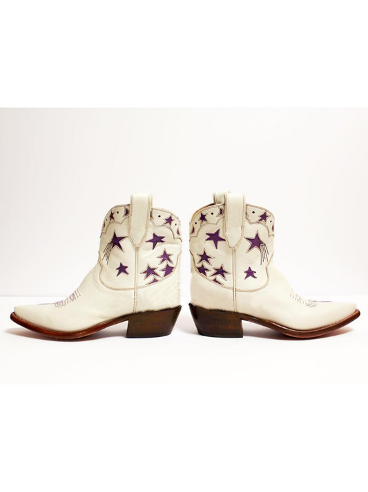 White Snip-Toe Purple Star And Moon Inlay Wide Calf Ankle Booties