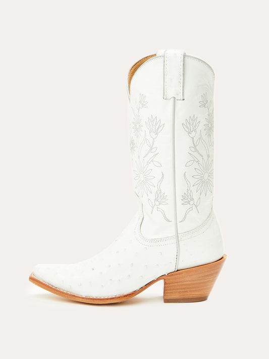 Contrast White And Ostrich Print Snip-Toe Plants Embroidery Mid Calf Cowgirl Boots