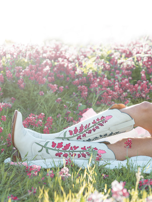 White Almond-Toe Rose Red Bluebonnet Inlay Wide Calf Tall Knee High Cowgirl Boots