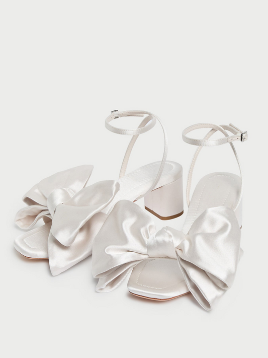 Ivory Satin Square-Toe Ankle Strap Big Bow Sandals