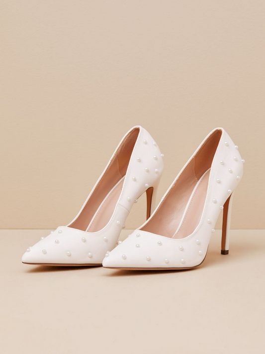 White Pointed-Toe Pearls Pump High Heels