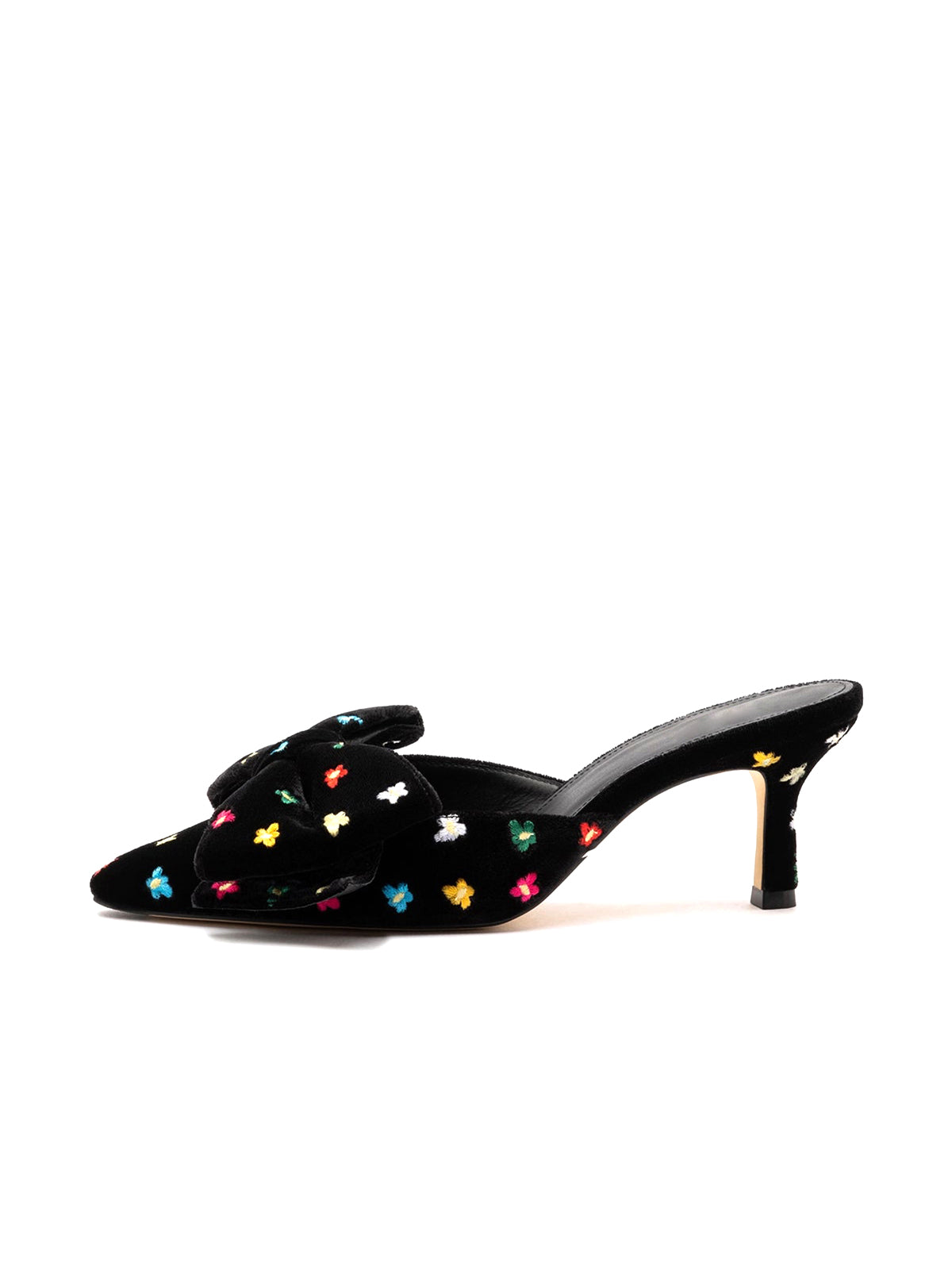 Black Velvet Pointed-Toe Flowers Embroidery Big Front Bow High Heels