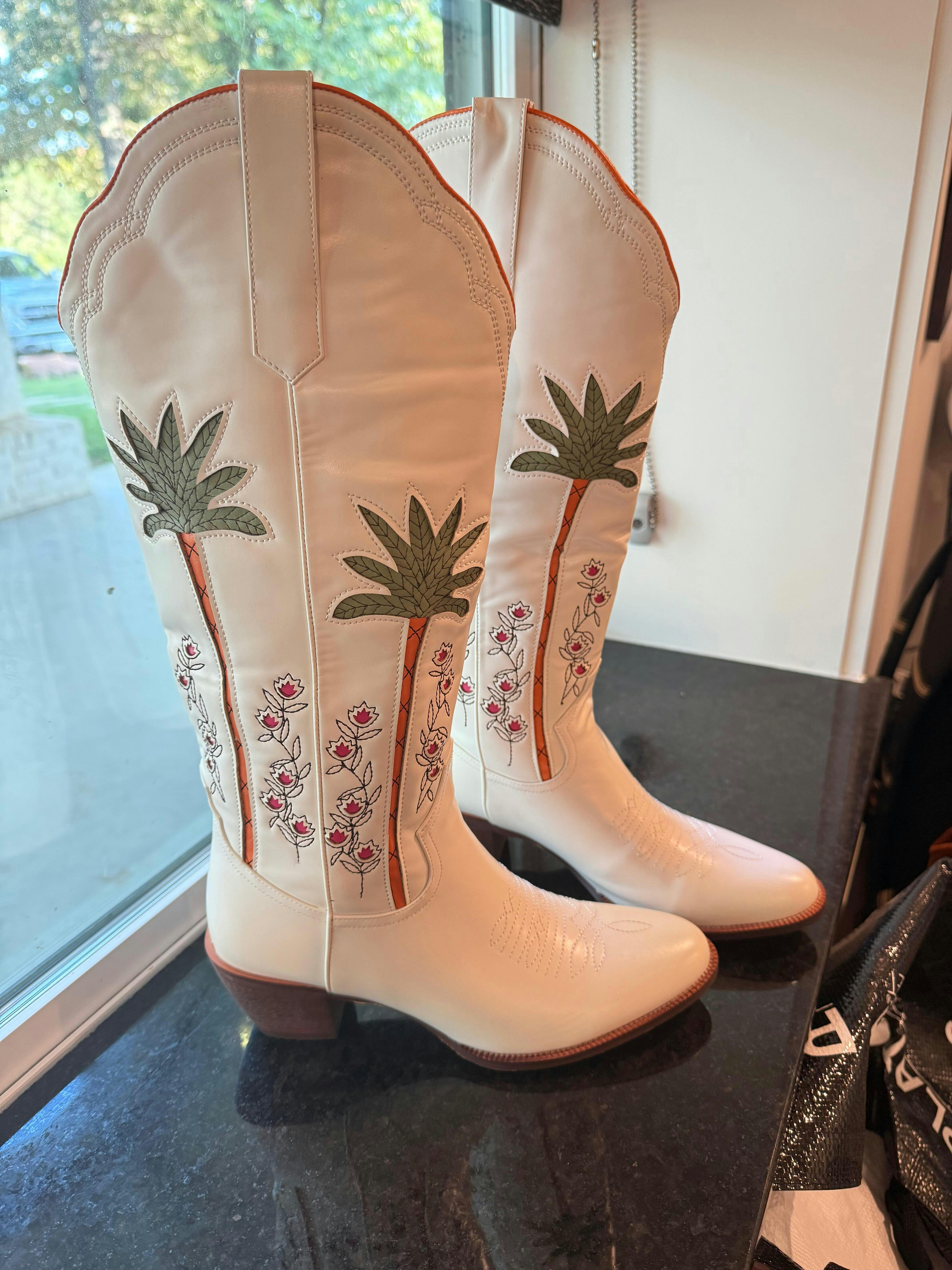 Step into a world of serene elegance with these boots. The soft white shade evokes calm skies, while the intricate palm and flower inlays wrap around the shaft like a breeze through a blooming garden. The almond-toe silhouette adds a graceful touch, and the wide calf design ensures comfort with every stride.