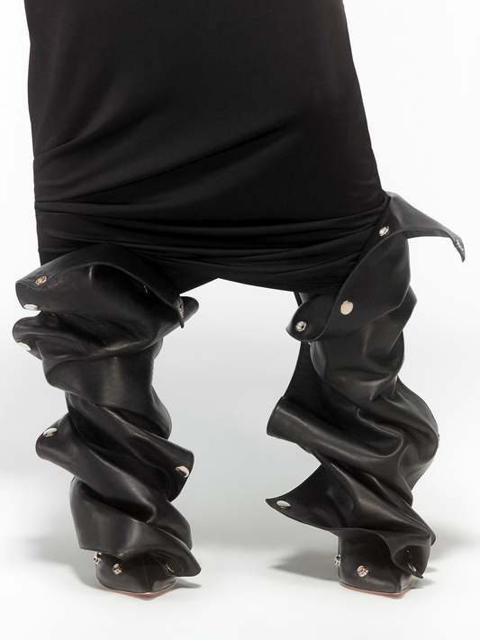 Black Crinkle Pointed-Toe Detachable Snap Panel Full-Zip Mid Calf Stiletto Boots