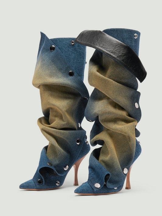 Blueyellow Denim Pointed-Toe Detachable Snap Panel Full-Zip Mid Calf Stiletto Boots