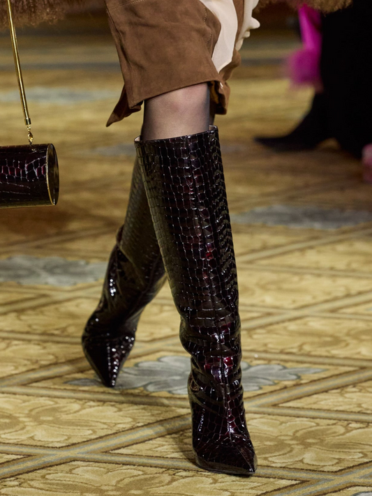 Patent Burgundy Crocodile Print Wide Calf Tall Knee High Boots