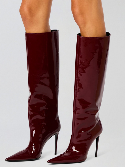 Patent Burgundy Pointed-Toe Wide Calf Tall Knee High Boots