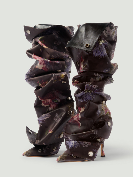 Brown Flower Cloth Pointed-Toe Detachable Snap Panel Full-Zip Mid Calf Stiletto Boots