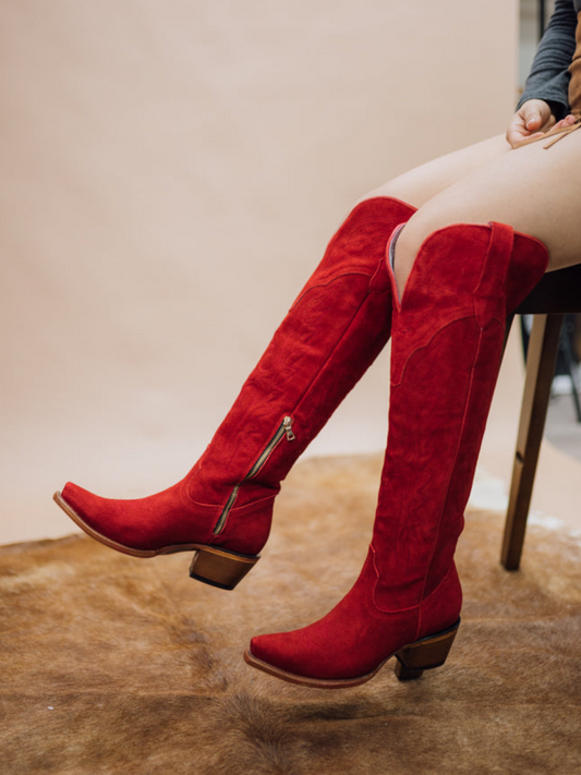Eagle Embroidery Snip-Toe Half-Zip Over-The-Knee Tall Cowgirl Boots - Red Faux Suede