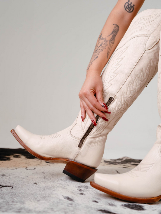 Eagle Embroidery Snip-Toe Half-Zip Over-The-Knee Tall Cowgirl Boots - Ivory