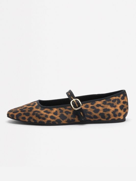 Leopard Print Cloth Square-Toe Bridge Strap Closure With Buckle Ballet Flats
