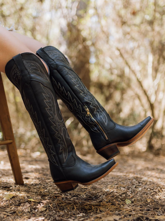 Eagle Embroidery Snip-Toe Half-Zip Over-The-Knee Tall Cowgirl Boots - Black