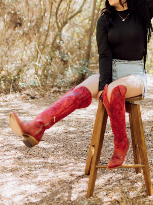 Eagle Embroidery Distressed Snip-Toe Half-Zip Over-The-Knee Tall Cowgirl Boots - Red
