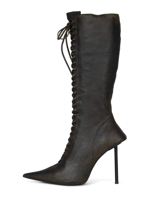 Distressed Brown Lace-Up Pointed-Toe Full-Zip Tall Mid Calf Stiletto Boots