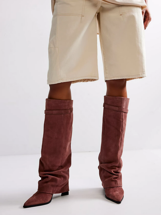 Faux Suede Pointed-Toe Buckle Fold-Over Mid Calf Boots - Mauve