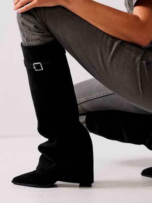 Faux Suede Pointed-Toe Buckle Fold-Over Mid Calf Boots - Black