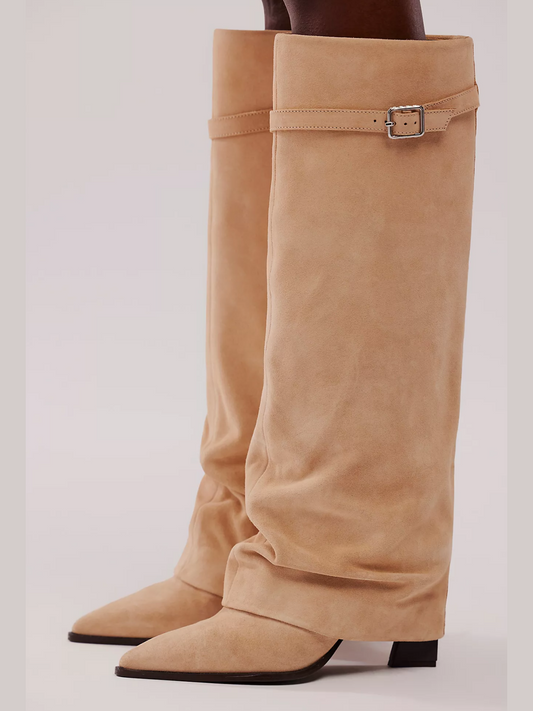 Faux Suede Pointed-Toe Buckle Fold-Over Mid Calf Boots - Frappe