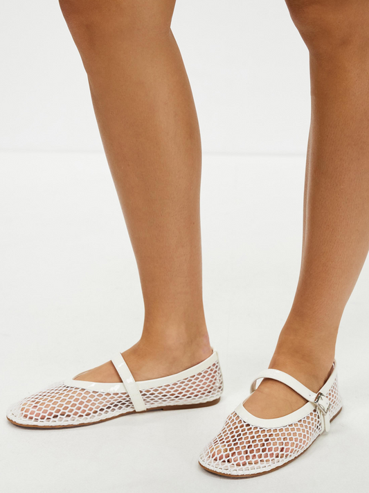Fishnet Round-Toe Ballet Flats Mary Janes With Buckled Strap In White