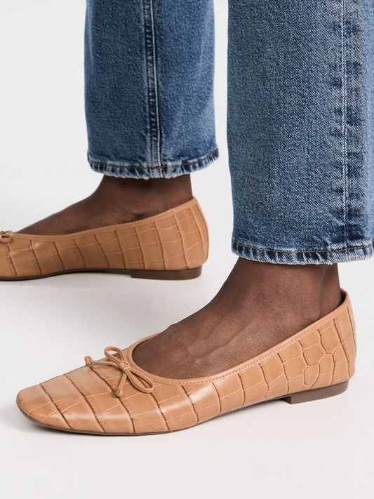 Honey Peach Crocodile Embossed Bow Square Toe Ballet Flats