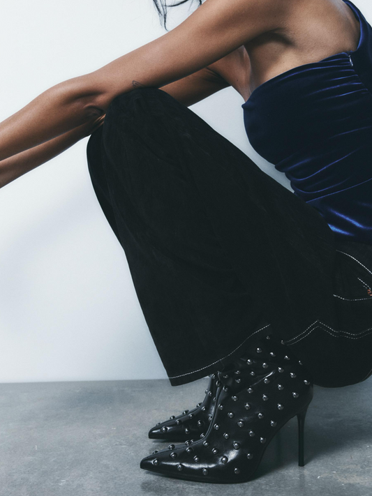 Black Pointed-Toe Studded Full-Zip Stiletto Ankle Booties