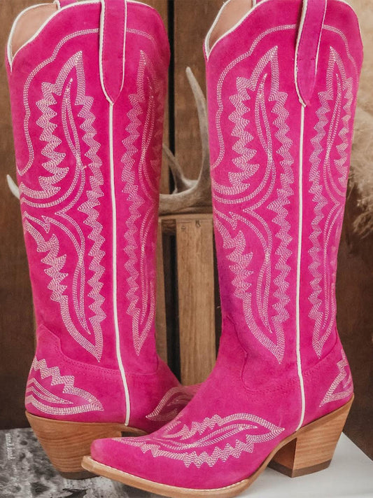 Western Embroidery Tall Snip-Toe Half-Zip Knee High Cowgirl Boots - Pink