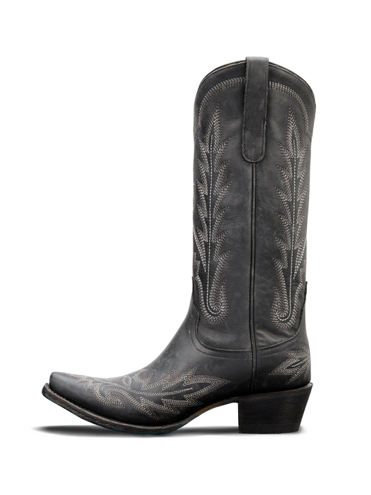 Western Snip-Toe Classic Embroidery Mid Calf Cowgirl Boots - Distressed Black