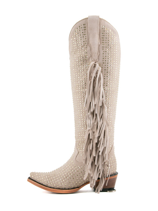Beige Faux Suede Snip-Toe Half-Zip Fringe Rhinestone Knee High Tall Cowgirl Boots