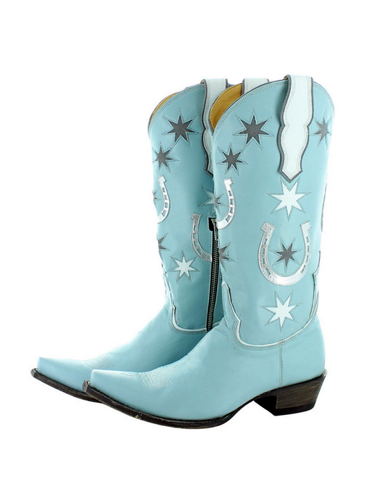 Baby Blue Snip-Toe Stars Inlay Horseshoe Applique Half-Zip Mid Calf Cowgirl Boots