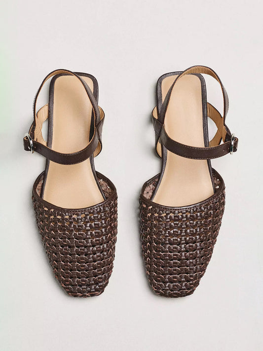 Brown Vegan Leather Woven Square-Toe Ankle Strap Flats