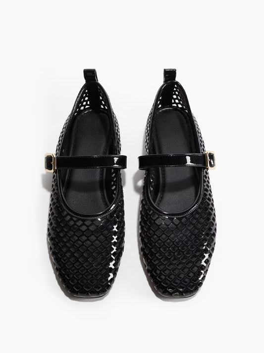 Perforated Square-Toe Bridge Strap Mary Jane Ballet Flats - Black Patent