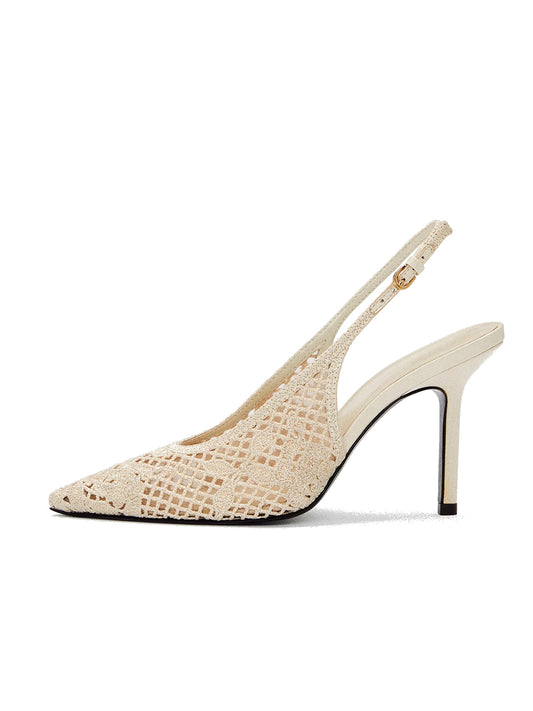 Cream Woven And Mesh Pointed-Toe Buckle Back Strap High Heels