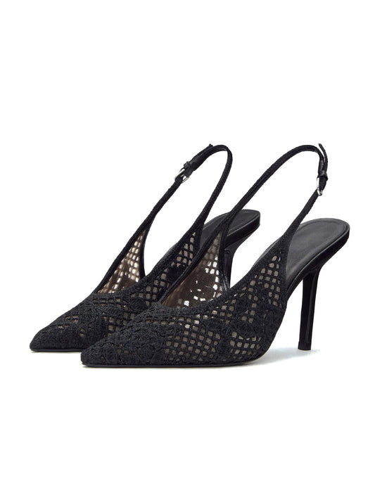 Black Woven And Mesh Pointed-Toe Buckle Back Strap High Heels