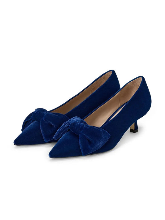 Navy Velvet Pointed-Toe Front Oversized Bow Slip-On Kitten Heels