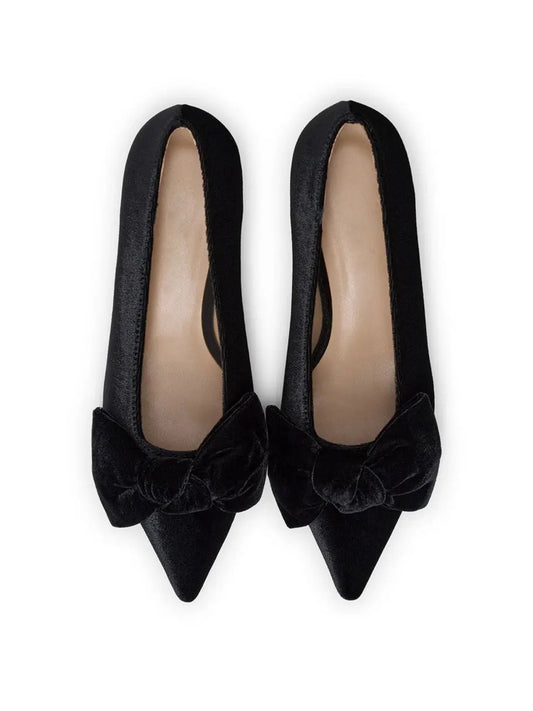 Black Velvet Pointed-Toe Front Oversized Bow Slip-On Kitten Heels