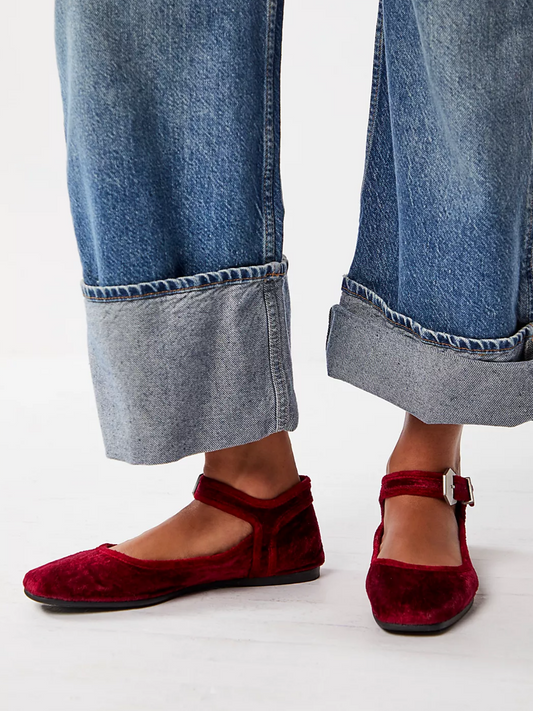 Dark Red Velvet Square-Toe Ankle Strap Mary Janes Flats
