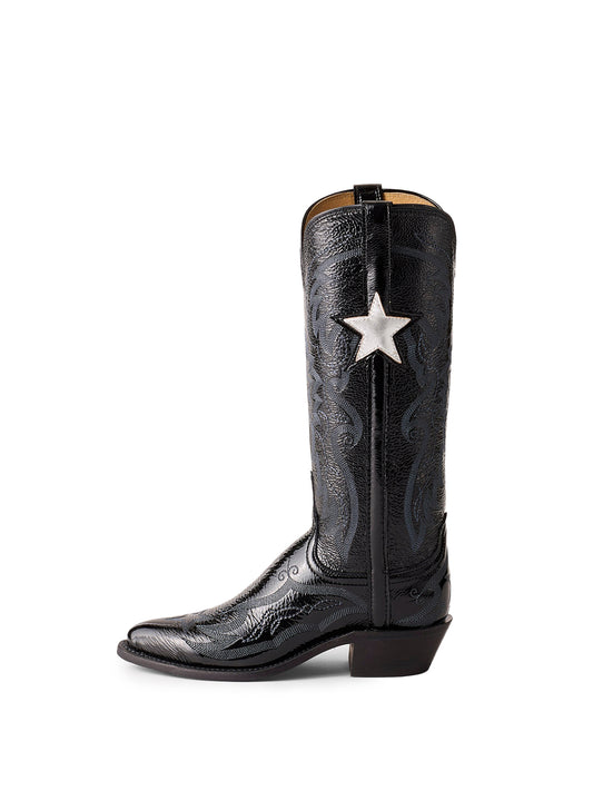Patent Black Stitch Pointed-Toe Mid Calf Cowgirl Boots With Metallic Star Applique