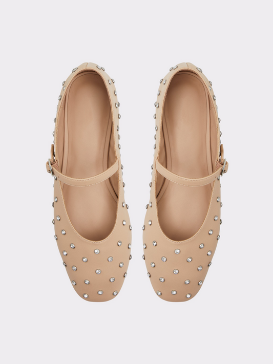 Beige Rhinestone Square-Toe Ballet Flats Buckle Detailed Mary Janes