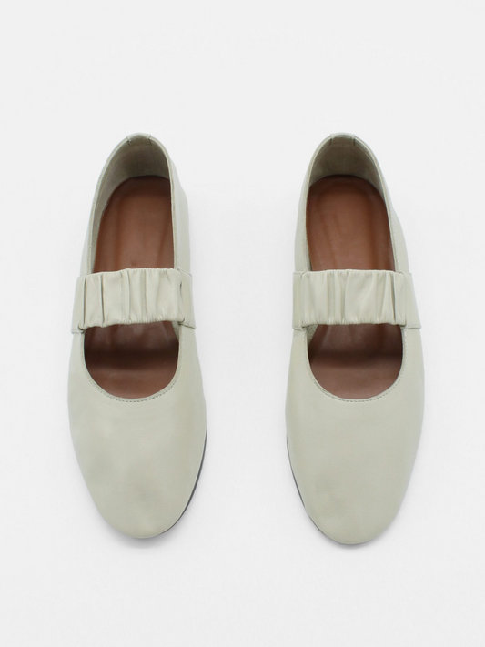 Beige Round-Toe Mary Janes Flat Shoes With Gathered Elastic Band