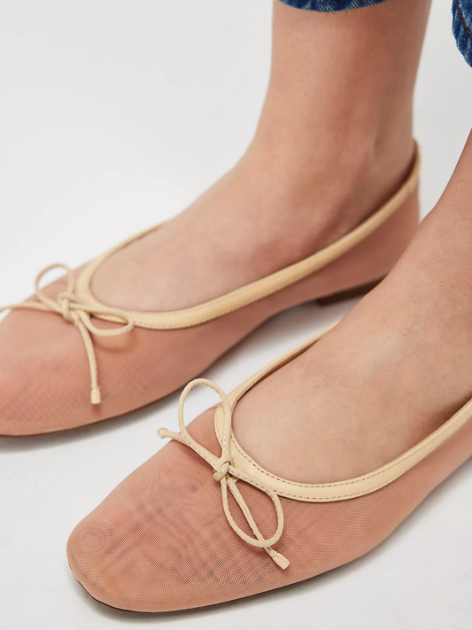 Beige Semi-Transparent Mesh Ballet Flats With Ankle Wrap Strap