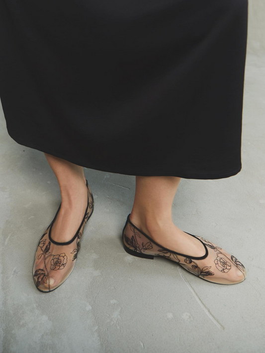 Beige Semi-Sheer Mesh Ballet Flats With Black Floral Embroidery