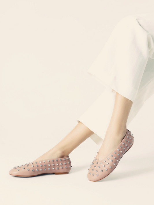 Beige Shiny Rhinestone Strass Semi-Transparent Mesh Ballet Flats
